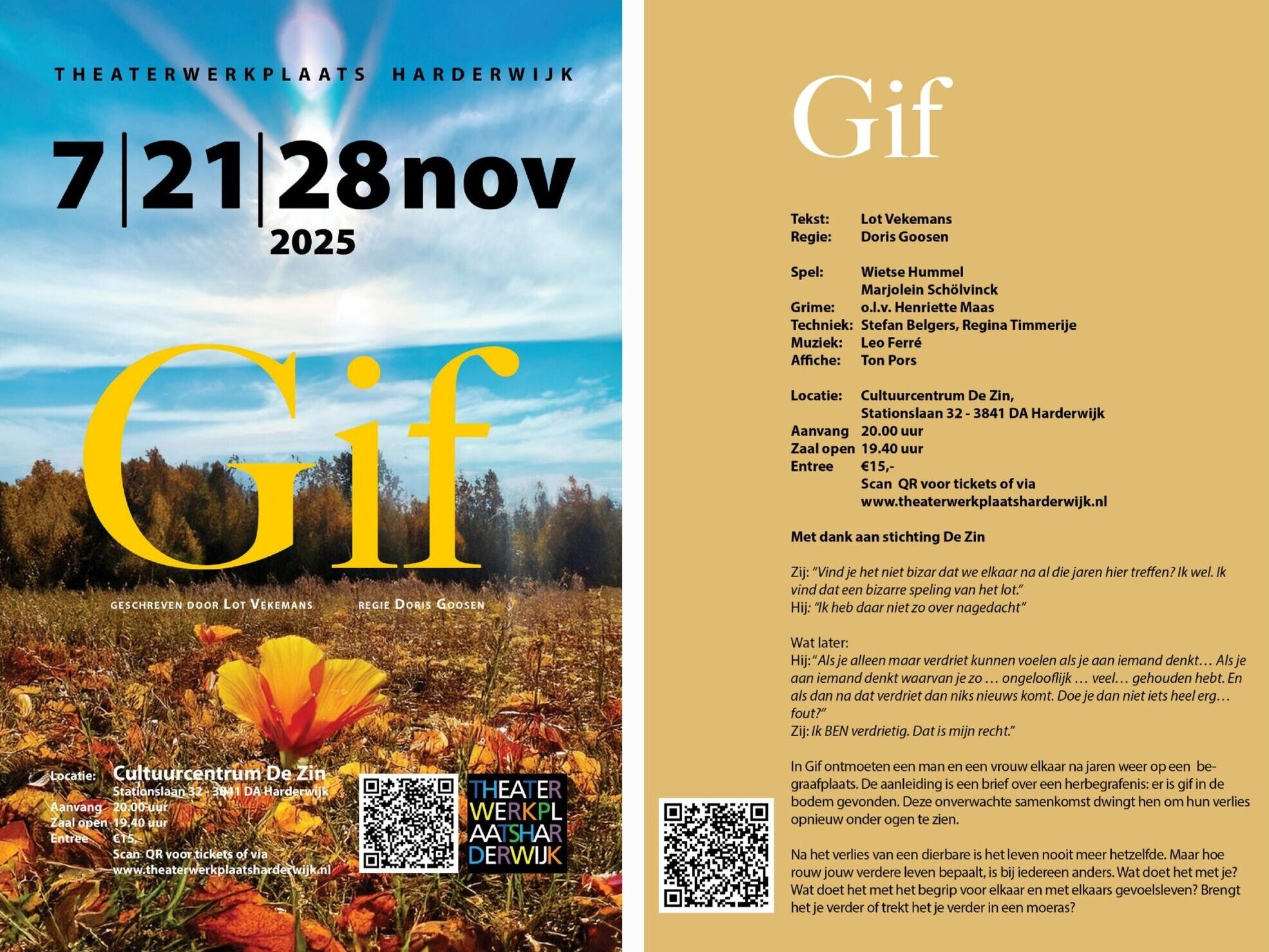 GIF , GESCHREVEN DOOR LOT VEKEMANS, HEEFT DORIS GOOSEN GEKOZEN ALS AFSCHEIDSREGIE BIJ DE THEATERWERKPLAATS IN HARDERWIJK.